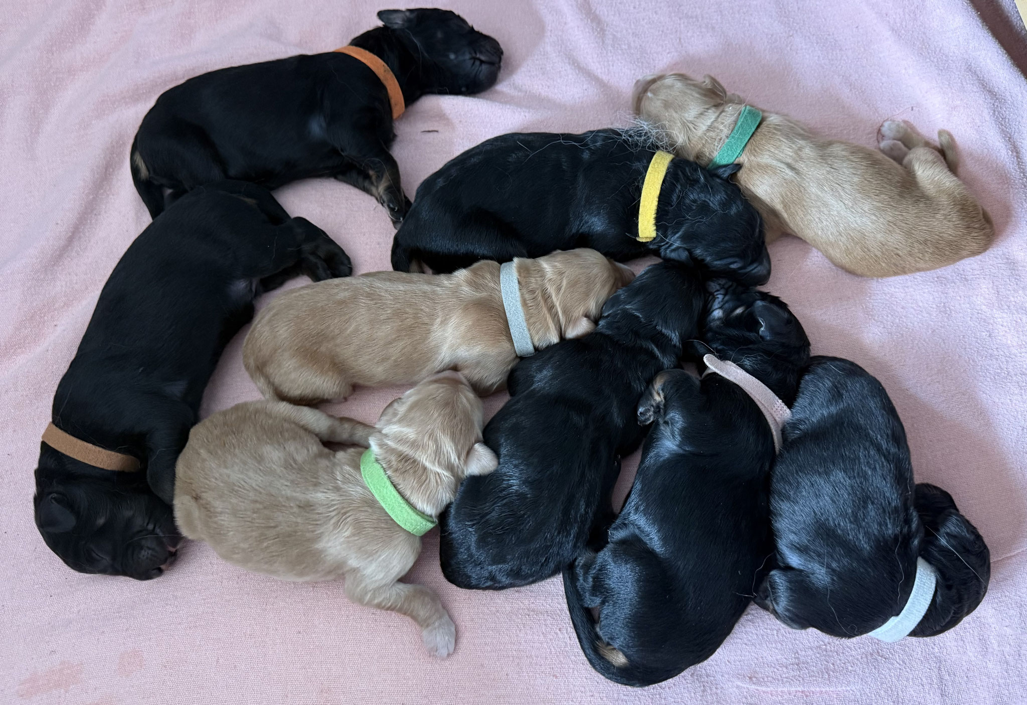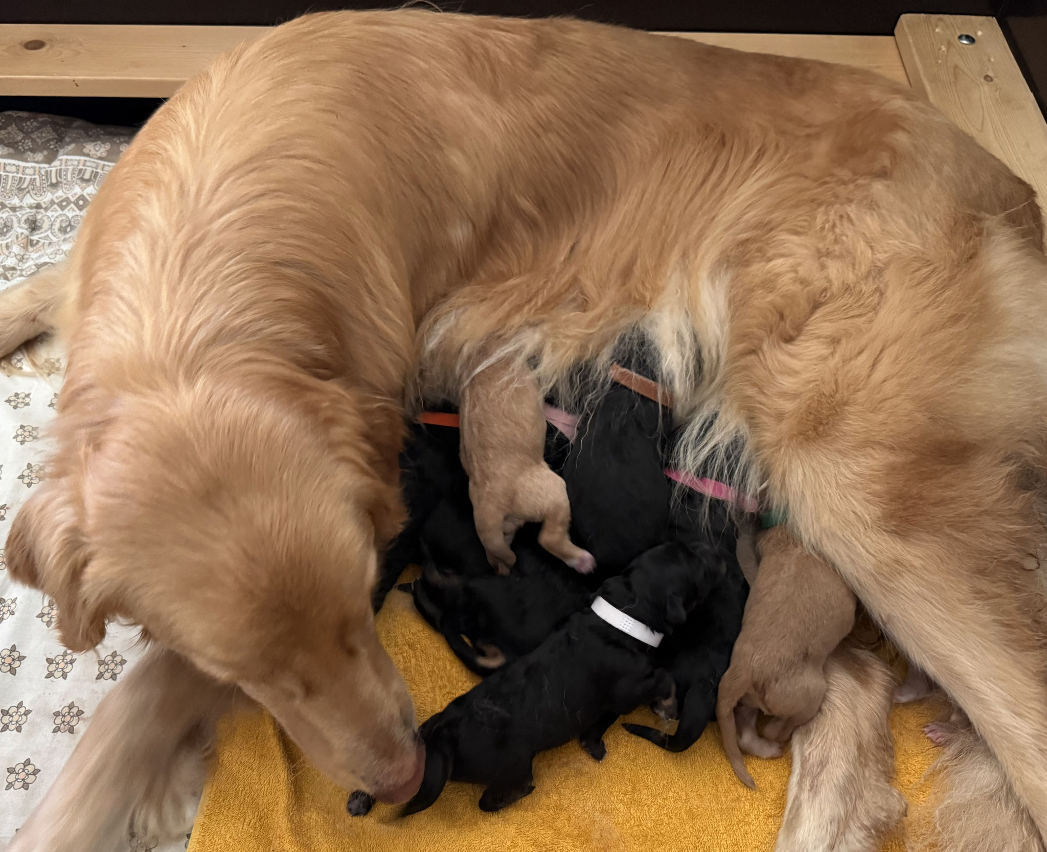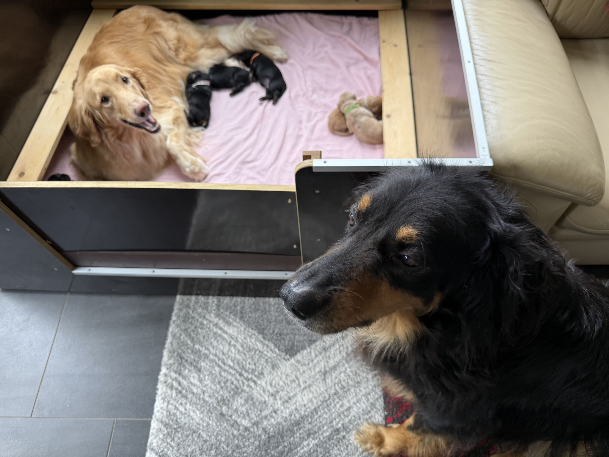 Am 08.09.2025 schenkte unsere Elli vom Bethanienberg uns den I-Wurf vom Bethanienberg. Geboren wurden 3 blonde, 1 schwarzmarkener Rüde und 5 schwarzmarkene Hündinnen. Alle Welpen sind wohlauf und Elli kümmert sich gut um die Zwerge.